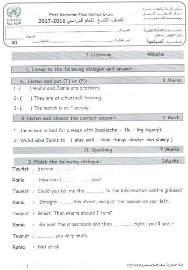 اختبار اللغة الإنجليزية للصف التاسع نهاية الفصل الأول 2017 المكتبة الفلسطينية الشاملة